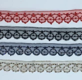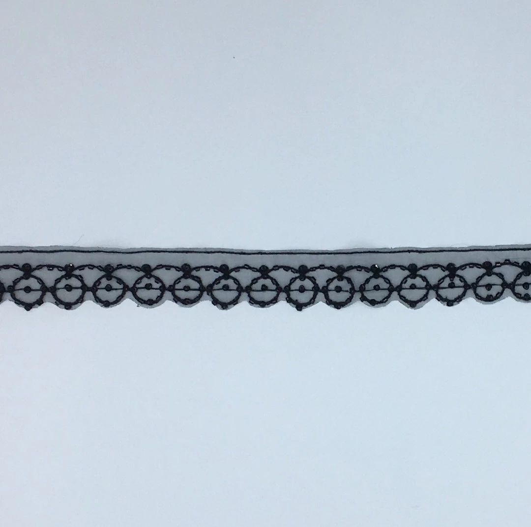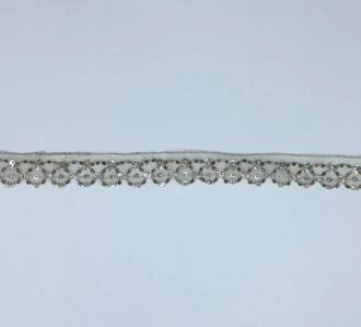 Scalloped bead trim is made up of beads in a delicate pattern gently making large swirls on mesh. 1″ wide. Sold by the yard.