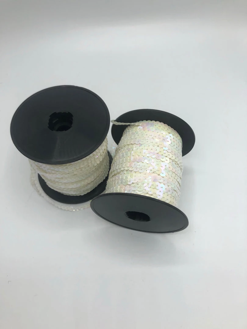 Single row flat 6 mm White Iris sequins sold by 72 yard bolts or equivalent of 72 yards between bolts.