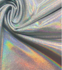 Starlet Holo Spandex! Its holographic foil adds a dynamic rainbow effect when the luminous face catches the light at any angle. This is the perfect holographic fabric option for costumes, dancewear, and gymnastics!