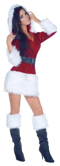 Costume includes zipper front mini dress with matching hood, traditional belt and boot cuffs.