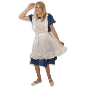 Alice in Wonderland blue nylon dress with a white cotton apron. Available in small, medium or large. Complete your look with white gloves and a blonde wig!