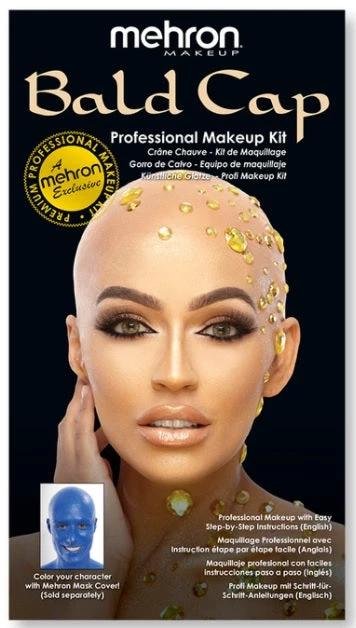 Bald Cap Kit, by Mehron, is a complete set of all the tools you need to learn and create this effect. Instructions included. Components: 5-Color palette, setting powder, powder puff, spirit gum, remover, latex, foam wedge and stipple sponge. Palette includes the Mehron olive series. Lt olive, mid lt olive, med olive, mid dk olive & dk olive.