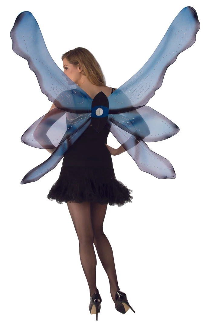 Blue Fairy or Butterfly Wings in sheer blue fabric with black outlining. Elastic shoulder straps. 42″H x 48″W