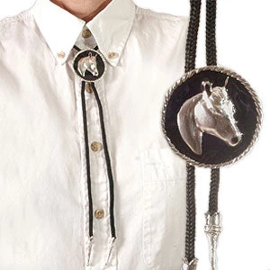 Cowboy String Tie is a metal emblem with a horse head that slides on a black string cord.