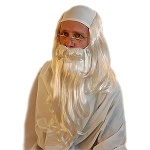 Father Time or Merlin wig set includes wig, beard and mustache in white.