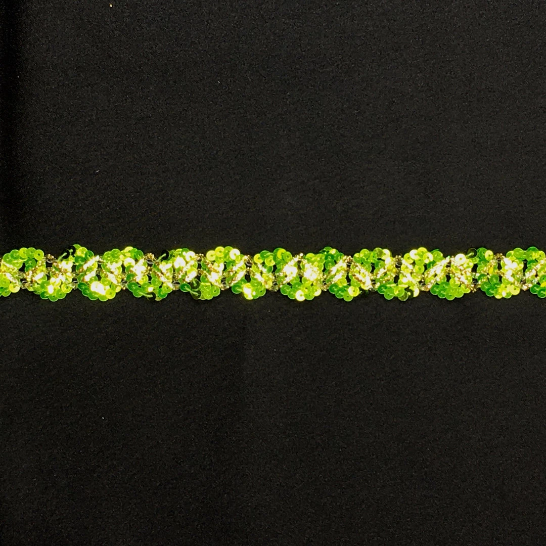 Fluorescent Snake Trim in lime. Measures 1/2” and has gold, iridescent thread weaving a wave pattern on top with the coordinating lime sequins.