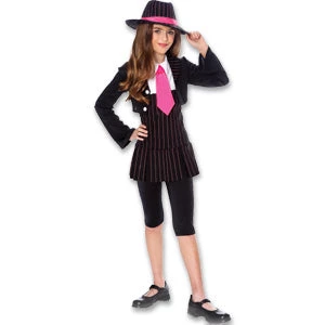 Gangsta’ Girl Child Costume for a sweet sided gangster. Includes dress with attached tie, shrug, hat and leggings.