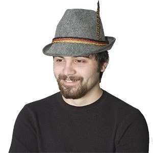 German Alpine Hat is handsomely trimmed with colorful roping and a natural feather. Sturdy wool felt material makes this hat nice for every day or costume wear. One size fits most. 5 1/2″ H