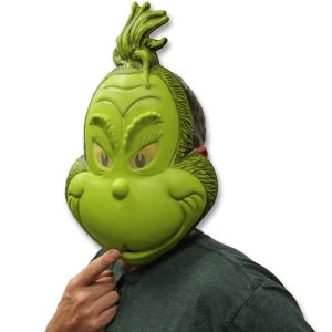 Grinch Mask is a slime green color front face mask made of durable plastic. Mesh see-thru eyes. 14″H