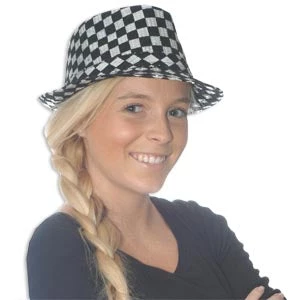 Houndstooth Print Fedora in black and white. One size fits most. 4 1/2″H 22″Circ.