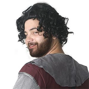 Hunk Wig is a curly wig suitable for many characters. Slicked back in front with dangling curls makes this perfect for Roman, Greek or favorite, seductive book/movie character. One size fits most with adjustable elastic. Black.