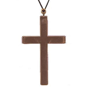Cross Necklace is made of heavy gauge gold plastic on a rope. 9″H