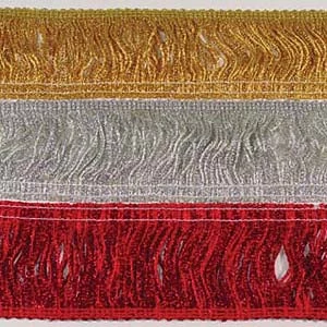 Metallic fringe is a 6″ long shiny trim which combines metallic strands with strands of rayon. This fringe is a great addition to complete many types of costumes such as dance, cheerleading, ice-skating, and ballroom. It is also great for decorating. Sold by the yard. Dry clean only.