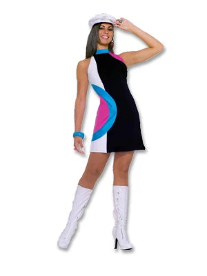 Mod Dress & Hat in stretch nylon. Brilliant blocked colors make this a 1970’s, far-out outfit! Slip-on with halter tie neck.