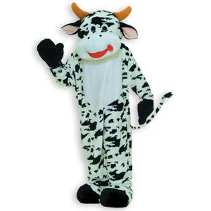 Moo Cow Mascot costume is a plush jumpsuit with attached mitts, foot covers and plush head with see-through mesh eyes. One size fits most.