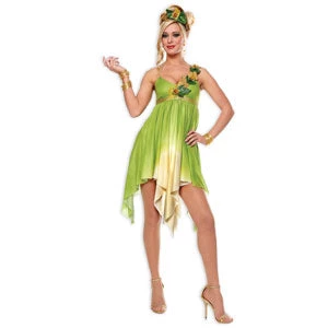 Mother Nature includes dress and headpiece. Features an empire waist trimmed in gold and an attached flower and leaf sash. Elastic around back for sizing. Hand wash.HURRY, LIMITED SUPPLY.