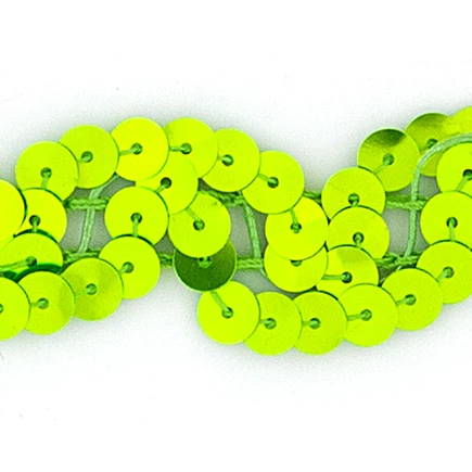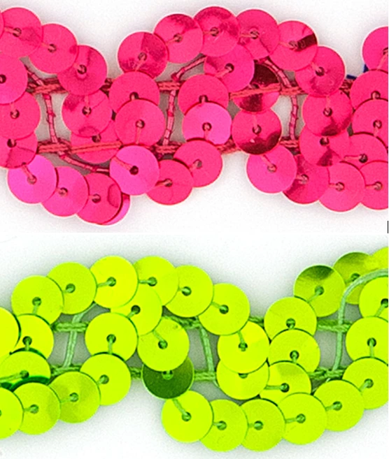 1″ Fluorescent Scallop Sequin Trim will add extra sparkle to your fluorescent or neon ensemble. Sold by the yard, available in 36 yd bolts. 1″W Blacklight makes it glow!
