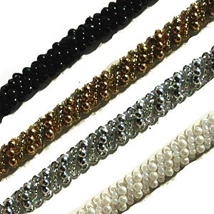 Beautiful beaded trim that has beads strung next to each other on a slant. Priced per yard, approximately 1/4″ wide.