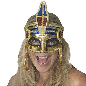 Cleopatra Eye Mask is a sturdy Egyptian style face mask. Alot of metallic shimmer and trimmed in fancy sequins. Soft velvet backing with elastic strap. One size fits most. 7″W x 8 1/2″H
