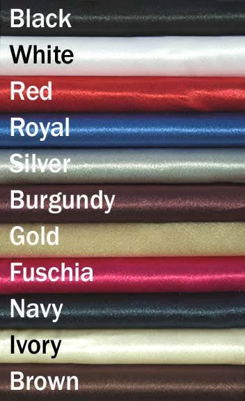 | Color | Black, Brown, Burgundy, Fuchsia, Antique Gold, Hunter, Ivory, Navy, Olive, Plum, Red, Royal Blue, Silver, White, Yellow, Gold, Sand, Dark Fuchsia |