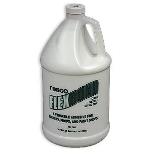 Rosco FlexBond is a clear, flexible scenic glue which bonds many porous and non-porous scenic materials. Rosco FlexBond dries to a clear, hard, yet pliable coating that does not suffer from the “tackiness” common in many other flexible glues, even after those glues have had days to dry! And unlike ordinary “white” glues which crack and break when flexed, the adhesive bond of Roscoe FlexBond remains extremely pliable and strong even as the materials bend and deform. Roscoe FlexBond is water-based and safe to use, available in pint bottles, gallon jugs (7653) or five gallon pails (7654) for $200.75.