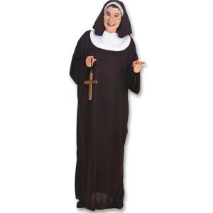 This Nun Costume includes the dress, headpiece and collar. This is a full-cut costume that should fit up to a size 20.
