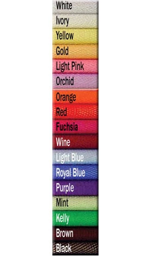| Color | Black, Brown, Fuchsia, Kelly Green, Gold, Ivory, Light Blue, Light Pink, Mint, Orange, Orchid, Purple, Red, Royal Blue, White, Wine, Yellow, Paris Pink |