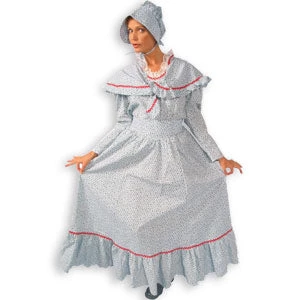 Pioneer Dress includes skirt, blouse, shawl, sash and bonnet. Assorted prints. One size fits most.