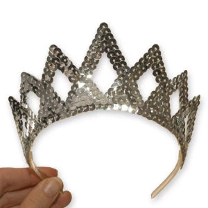Pointed Tiara is made of silver sequins on a clear headband. Great low price. 2″H