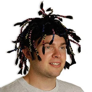 Tommy L Dread Wig is an attractive, short dreadlock style with colored rubber bands securing each dread. Synthetic material in black.