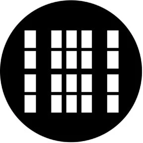 Vernacular pattern gobo. Standard size “B” stainless steel disc made to fit an ellipsoidal fixture with a 6″ lens and a 4 1/2″ gate.Gobo patterns are used to suggest scenery, create atmosphere and enhance the visual impact of your lighting design. To browse the entire line of designs, visit www.rosco.com.