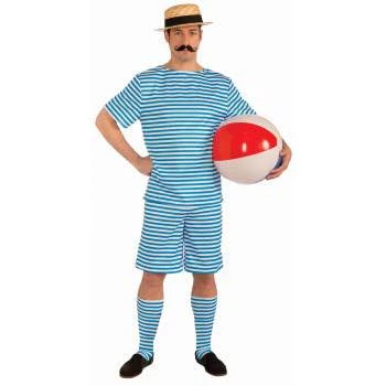 Old Fashioned Bathing Suit is made of cotton. Includes shirt, shorts and socks. Machine washable. Perfect for that 1920’s beachside look.
