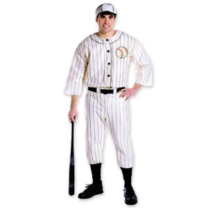 Old Time Baseball Player Costume includes shirt, hat and pants with elastic waist & attached belt. One size fits most up to 44″ chest, 37″ waist, approx 6′ tall. Spot clean only.