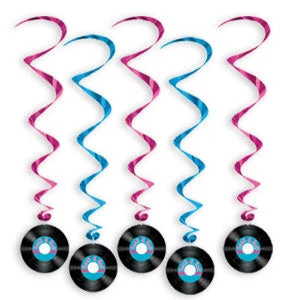 Rock & Roll Record Whirls party decoration. Assorted colors, contains 5 pcs. 40″L