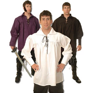 Swordsman Shirt is made of a heavy cotton blend. Lace-up neck and full sleeves that end with a 6″ lace-up cuff.Great for Cavalier, Pirate or Renaissance. Machine washable.