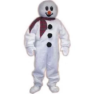 Snowman Suit is a white acrylic pile plush with pom poms & zippered back. Foam head, scarf, mitts & shoe covers; adult sizes: