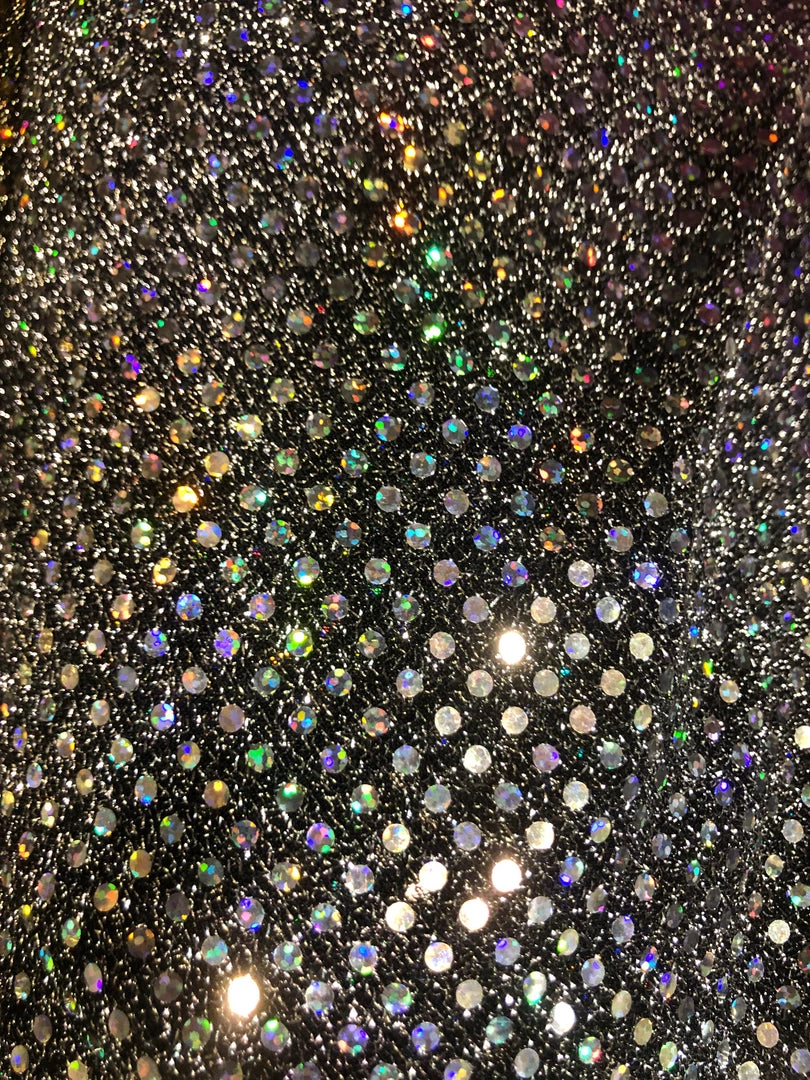 Spotlight Sequins on Knit. 3mm spotlight sequins have a holographic/glittery effect. 100% poly, metallic knit. 38″WBlack/Black(not pictured)is being discontinued, limited quantities available.