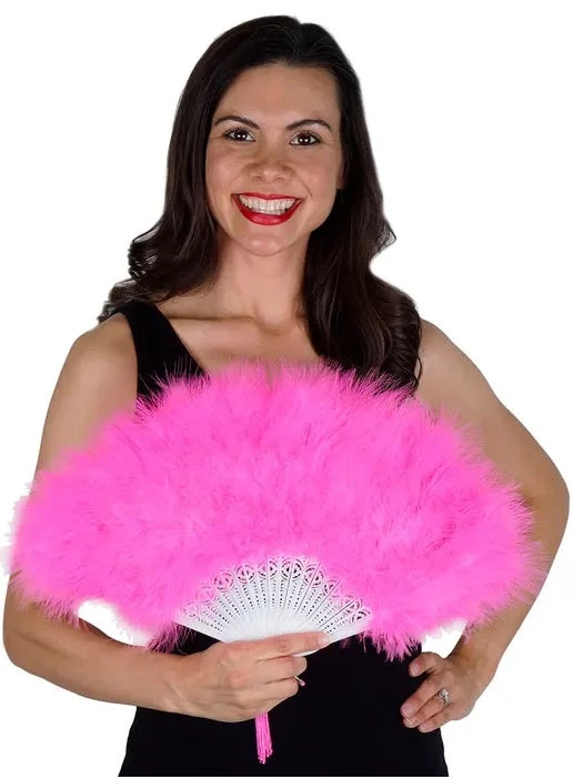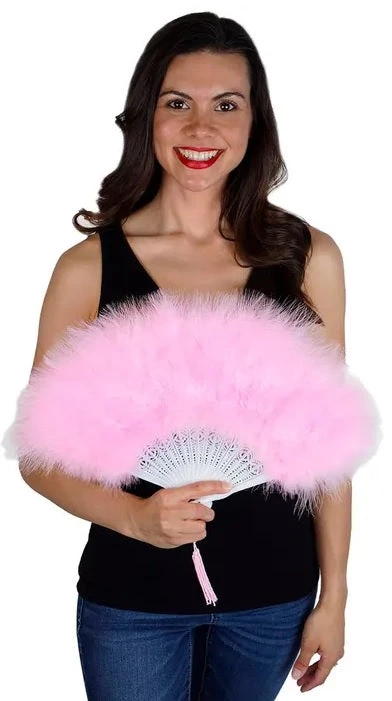 Marabou Fan unfolds to a full 20″. Plastic folding base with a thick covering of marabou feathers. 11″H X 20″ W COLORS MAY VARY